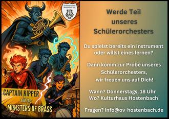 Wenn auch du ein Instrument lernen und mal in eine Probe schnuppern willst, komm einfach vorbei. Wir proben donnerstags ab 18:00 Uhr im Kulturhaus Hostenbach. Für weitere Infos folge uns auch gerne online: