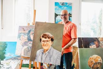 Künstler Jamil Soro mit Portraitgemälde von Emilie Koch