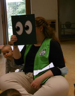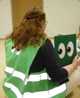 Um den Kindern zu verdeutlichen, dass die Fachkraft gerade beobachtet, wurden Materialien - ein grünes Klemmbrett und eine grüne Warnweste - zur Beobachtung eingeführt, erklärt und mit den Kindern besprochen. An beiden Utensilien sind große grüne Augen angebracht, die ansprechend und freundlich für die Kinder erkennbar sind.