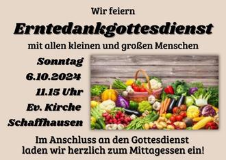 | SCH | 11.15 Uhr | Erntedankgottesdienst für Kleine und Große, anschl. Mittagessen, Pfarrerin Ira Köhler |