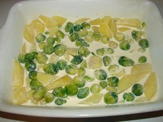 5. Das Kartoffel-Sahnegemisch in eine Auflaufform geben, den Rosenkohl dazutun.