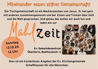 | ÜB | 12.00 Uhr | MahlZeit, der etwas andere Gottesdienst (mit Mittagessen) |