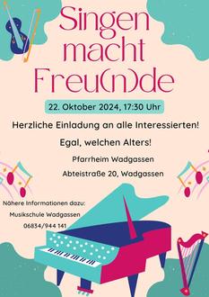Dazu möchten wir mit unserem neuen Angebot „Singen macht Freu(n)de“ einladen. Gemeinsames Singen, spontan, in lockerer Atmosphäre, Songs aus verschiedenen Jahrzehnten, Genres und Musikrichtungen, mit Freude und Spaß an der Musik, ohne musikalische Begabung, aber dafür mit umso mehr Freude und Mut zu singen.