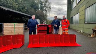 Wehrführer Guido Hübschen (links) und Stefan Ernst vom Bauhof der Gemeinde (rechts außen) präsentieren die neuen Hochwasserschutzrampen