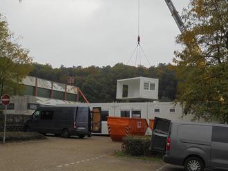 Bereits in der Friedhof Straße konnten wir einen großen Kran über den Bäumen entdecken und ein unbeladener Tieflader fuhr an uns vorbei. Folglich lagen wir mit unserer Vermutung richtig und der Aufbau der Container hatte bereits begonnen. An der Biststalhalle angekommen gab es allerhand zu entdecken. Da standen mehrere Autos verschiedener Firmen, ein Tieflader mit zwei Containern, der bereits entdeckte Krahn und viele Bauarbeiter mit Helm waren am Arbeiten. Einige Container standen bereits auf Pfählen nebeneinander aufgereiht am Boden. Aus diesen waren diverse Geräusche zu vernehmen, also wurde dort ebenfalls schon schwer gearbeitet. Beim Betrachten der Container fiel uns auf, dass sie Unterschiede aufzeigten. Die einen hatten Fenster, andere zwei offene Seiten oder eine Tür war zu erkennen. Es erinnerte uns ein wenig an Legosteine, aus denen ein Haus gebaut wird.