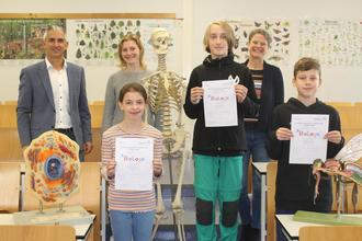 Am 18.09.23 fand die erste von zwei Runden des diesjährigen BioLogo-Wettbewerbs statt. Der Landeswettbewerb richtet sich an Biologie-interessierte Schülerinnen und Schüler der Sekundarstufe I der allgemeinbildenden Schulen im Saarland. Auch Schülerinnen und Schüler aus den Klassenstufen 6, 7, 8 und 9 des Albert-Einstein-Gymnasiums nahmen am Wettbewerb teil. Ida Hallebach aus Klassenstufe 7 belegte Platz 1 aller Schülerinnen und Schüler unserer Schule im Anforderungsniveau 2. Tom Sigrist erreichte Platz 2 im selbigen Anforderungsniveau. Da Ida und Tom zu den 40 erfolgreichsten Teilnehmerinnen und Teilnehmern ihres Anforderungsniveaus gehörten, wurden sie zur 2. Runde eingeladen, die am 16.10.23 am Albert-Schweitzer-Gymnasium in Dillingen durchgeführt wurde. Die Ergebnisse der 2. Runde stehen noch aus. Auch Jakob Heidecker aus Klassenstufe 8, der in der ersten Runde Platz 1 aller Schülerinnen und Schüler des Albert-Einstein-Gymnasiums im Anforderungsniveau 3 erreichte und zu den 40 erfolgreichsten Teilnehmerinnen und Teilnehmern seines Anforderungsniveaus zählte, nahm an der 2. Runde des Wettbewerbs teil. In einer Feierstunde überreichte der stellvertretende Schulleiter Dr. Markus Schmitt Ida Hallebach, Tom Sigrist und Jakob Heidecker am 19.10.23 ihre Auszeichnungen der ersten Runde. Darüber freuten sich auch die Fachlehrerinnen Frau Lux und Frau Monfort, die den BioLogo-Wettbewerb dieses Jahr am Albert-Einstein-Gymnasium organisierten. Die Schulgemeinschaft des Albert-Einstein-Gymnasiums wünscht Ida, Tom und Jakob weiterhin viel Erfolg und hofft, dass sie ihr Interesse und ihre Freude am Fach Biologie beibehalten.