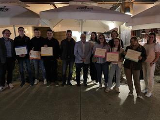 Die Absolventinnen und Absolventen des diesjährigen AbiBac-Jahrgangs am Warndt-Gymnasium erhielten in der vergangenen Woche ihre französischen Diplome. Lara-Marie Bas, Philipp Bollinger, Lara Faust, Maren-Anouk Geiger, Julian Hemmerling, Viktoria Jochemczyk, Michelle Reinhard, Julian Siffrin, Nicolas Traut und Kiara Uhlig, die neben der deutschen auch die französische allgemeine Hochschulreife absolvierten, waren zu einer kleinen Feier mit Abendessen in ein Restaurant in St. Avold eingeladen und feierten dort mit Frau Chiron und Frau Lantz, die Geschichte und Erdkunde auf Französisch unterrichten, Herrn Hischemöller, Fachkoordinator Französisch, Herrn Müller, Abteilungsleiter Didaktik sowie Herrn Rau, Stellvertretender Schulleiter. Der Ort dieser kleinen Feier ist auch Symbol für die grenzüberschreitende Perspektive, die zum deutsch-französischen Doppelabschluss gehört.