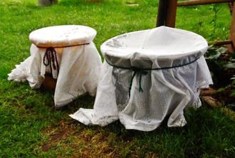 Zum Herstellen einer Beinwelljauche schneiden Sie ungefähr ein Kilo Beinwellblätter und -stängel klein. Geben Sie diese dann in einen großen Eimer (bitte keinen Metalleimer!) und füllen Sie das Pflanzenmaterial mit ca. 10 Liter Wasser auf. Am besten eignet sich hier Regenwasser. Legen Sie ein Tuch über diesen Eimer um die Eiablage vor allem von Stechmücken zu verhindern. Ich nehme hierzu immer alte, dicht gewebte Gardinen, die lassen eine Luftzirkulation zu, aber es gelangen keine Mücken an die Wasseroberfläche.