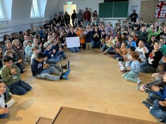 Nachdem in den vergangenen Wochen das erlaufene Geld nach und nach auf dem Konto eintraf, konnte am letzten Schultag vor den Herbstferien endlich ein Scheck übergeben werden. Dazu hatte die Schule Frau Fickinger vom Projekt des Wünschewagens eingeladen, und die Schülersprecher Bruno und Janosch moderierten eine ausführliche Fragerunde zum Thema. Und Fragen gab es genug von den Kindern der ersten bis vierten Klassen. Sie erfuhren, dass sich Menschen einerseits oft wünschen, Familienangehörige noch einmal zu besuchen, andererseits aber auch gerne zu besonderen Orten gefahren werden, sei es ins Fußballstadion oder sogar zu einer Zaubershow.