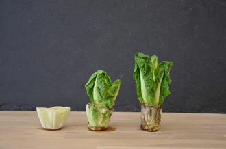Anstatt den Strunk eines Salatkopfes (er sollte ca. 5 cm haben) wegzuwerfen (hier eignen sich Eisberg-, Kopf- und Romana-Salate besonders), wird er für einige Tage in ein Glas mit Wasser gesetzt. Das Wasser sollte unbedingt regelmäßig (mindestens jeden 2. Tag!) gewechselt werden, damit es nicht zu Fäulnis kommt. Und schon nach wenigen Tagen an einem hellen, warmen Platz, wird man dann z. B. beim Romana-Salat neues Leben aus seiner Mitte sprießen sehen. Wenn sich dann unten am Strunk neue Wurzeln gebildet haben, dann ist es an der Zeit, den Strunk vom Wasser (jetzt zur kalten Jahreszeit) in einen Topf mit Erde zu setzen, und diesen an einen geschützten Platz zu stellen. Nehmen Sie Anzuchterde, sie eignet sich besonders gut für dieses Verfahren. Beim Standort hat natürlich jede Pflanze leicht unterschiedliche Ansprüche. Generell sollte es allerdings hell (jedoch ohne direkte Sonneneinstrahlung!) und warm um die Regrow-Pflanzen sein.