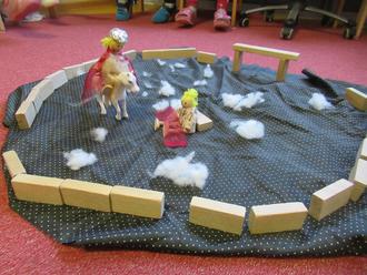 Zum St. Martinstag haben die Kinder der Krippe für alle Kinder der Kita Waldwichtel Brezeln gebacken. Die Kindergartenkinder legten die überlieferte St. Martinsgeschichte zu einem großen Bodenbild und spielten die bekannten Lieder in Verkleidungen nach. Sie überlegten sich wie sie am sinnvollsten die Brezel teilen, damit alle ein Stück abhaben konnten.