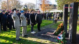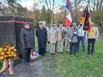 Französische und deutsche Reservisten am ‘Denkmal gegen Krieg und das Vergessen’ (u.a. vorne l.: Rudi Herrmann (Stabsfw d.R.), Saarl. Reservistenverband)