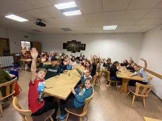 Mit dem Bus sind wir nach Weiskirchen in die Jugendherberge gefahren. Dort angekommen, sind wir als Erstes zum Mittagessen gegangen und haben danach die Jugendherberge erkundet. Am Abend haben wir uns alle für die Klassenparty schick gemacht und um 21 Uhr ging es dann in die Zimmer und ins Bett. Dort durften wir noch ein bisschen quatschen. Einige von uns hatten ein bisschen Heimweh oder Angst vor Alpträumen, aber das war kein Problem, denn wir hatten ja Frau Feids Spezial-Kissen-Spray gegen Heimweh und Alpträume. Das Spray duftete nach Vanille und Pfirsich und wir konnten alle gut schlafen.