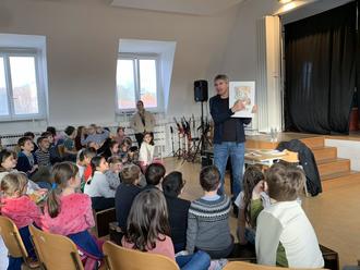 Für die Erst- und Zweitklässler hatte er eines seiner Bücher ausgewählt, mit denen er die jungen Zuhörer schon nach ein paar Minuten in seinen Bann zog: „Alfredo, ein Pferd geht in die Schule“. Der Autor wechselte dabei fließend zwischen Passagen des Vorlesens und des Erzählens und sorgte immer wieder für Lacher, wenn er mit verstellter Stimme die Gefühle der Protagonisten darstellte. Dabei gelang es ihm, auch Kinder zu fesseln, die im Alltag nicht zu den eifrigsten Leseratten gehören.