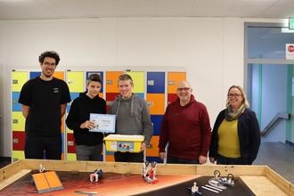 Nun fand die Übergabe der Sachpreise statt. Mario Korherr, der an der HTW für die Initiative zum Einsatz von Robotik an Schulen verantwortlich ist, besuchte die Robotik-AG zu einem ihrer monatlichen Treffen am Samstagvormittag in der Schule und übergab den Preis an die von Frau Rinck und Herrn Rau geleitete AG und das Team „Total Error“.