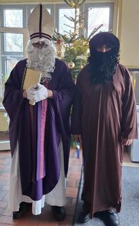 Auch in diesem Jahr besuchte der Nikolaus die Kinder am Schulstandort Schaffhausen. Mal witzig und mal ernst besprach er mit den Kindern ihr Verhalten. Außerdem brachte er neben Weckmännern und Kinderpunsch auch Orangen und Zitronen für das Wasser aus dem Wasserspender. Eine Idee der Kinder, die im Schülerparlament entstand.