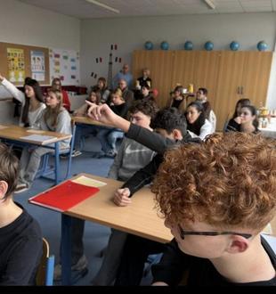 Empfangen wurden unsere Gäste in unserem BissTro. Geleitet von unserer Kollegin Frau Löcher sorgten einige 6. Klässler mit ihrer Ukulele für einen wunderschönen musikalischen Empfang. Vielen Dank dafür. Herr Powilleit begrüßte unsere Gäste zusammen mit Herrn Schamschula in einem deutsch-französischen Tandem. Zudem wurde unseren Gästen der Aufbau unseres bilingualen Zuges erklärt. Nachdem wir dadurch bereits Neugierde wecken konnten, zeigten wir den Franzosen einige Funktionsräume unserer Schule. Ein Highlight und sehr passend für unseren französischen Besuch war natürlich unser Bili-Raum, der von uns allen, Schülern und Lehrern, für einen herzlichen Empfang mühevoll vorbereitet wurde. Im Bili-Raum konnte dann der 7er bilinguale E-Kurs in einer Mini-Unterrichtsstunde noch zeigen, was er bereits kann. Unsere Gäste waren begeistert. Wir bekamen von unseren Gästen ein schönes Plakat mit der Kathedrale von Montpellier als Geschenk für unsere Gastfreundschaft überreicht. Wir freuen uns sehr darüber und bedanken uns herzlich! Diesen äußerst gelungenen Besuch rundeten wir noch mit einem gemütlichen Verweilen mit Schnittchen und Kuchen in der französischen Atmosphäre unseres Raumes ab.