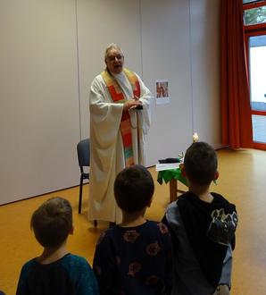 Am Freitag, dem 03.02.2023, trafen sich alle Gruppen des Kindergartens um 10 Uhr in der Turnhalle. Bereits einige Tage zuvor wurde mit den Kindern im Morgenkreis über den heiligen Bischof Blasius, der auch Arzt war und seine Lebensgeschichte gesprochen. Unterstützung für den Wortgottesdienst bekamen wir an diesem Morgen von Herrn Pastor André Kardas, der extra in den Kindergarten kam, um jedem Kind und auch den Erzieherinnen den Blasiussegen zu spenden. Als Eröffnungslied sangen wir alle zusammen „Wo zwei oder drei in meinem Namen versammelt sind“. Nach dem Kreuzzeichen hörten wir die Geschichte des heiligen Bischofs Blasius und betrachteten ein Bild von ihm. Dann empfingen zuerst die Krippenkinder den Blasiussegen und im Anschluss die Kindergartenkinder. Die Segnung begleiteten wir musikalisch mit dem Lied „Du bist immer da“. Der Blasiussegen soll uns vor Halskrankheiten und allem Bösen bewahren. Zum Abschluss beteten wir noch gemeinsam das „Vater Unser“.