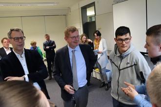 Staatssekretär Jan Benedyczuk (links) und Generalkonsul Sébastien Girard (zweiter von links) im Austausch mit Schülerinnen und Schülern)