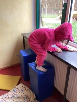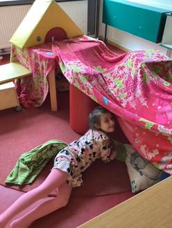 Diese Woche haben wir alles an Konstruktionsmaterial wie Legos, Bausteine usw. aus unserem Bauraum entfernt. Hinein kamen stattdessen ein Tisch, Decken, Kissen, Wäscheklammern, leere Pappkartons, große Bauelemente aus Schaumstoff und jede Menge Putzschwämmchen. Sehr spannend war zu beobachten, welch super Ideen die Kinder hatten, mit diesen einfachen Materialien zu bauen und zu konstruieren. Mit den Decken und Kissen, dem Tisch und den Wäscheklammern entstanden unterschiedliche Häuser und Höhlen. Mit den Schaumstoffelementen wurde ein Parcours gebaut. Bei diesem musste man die andere Seite des Raumes erreichen, indem man nur über die Schaumstoffelemente gehen bzw. klettern durfte, ohne den Boden zu berühren. Mit den Putzschwämmen kreierten die Kinder phantasievolle Bauwerke. Die Kinder waren so kreativ und hatten jede Menge Spaß, sodass wir gemeinsam überlegen mit welchen Sachen wir noch erfinderisch werden können.