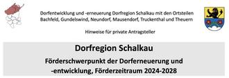 Die Dorfregion Schalkau wurde durch das Land Thüringen als Förderschwerpunkt der Dorferneuerung anerkannt. Hierdurch ist es der Kommune als auch Privaten, Vereinen, Unternehmen und vielen anderen möglich, in den kommenden Jahren bis 2028, Zuschüsse des Landes Thüringen für verschiedenste Maßnahmen aus dem Förderprogramm der „Dorferneuerung und -entwicklung“ zu beantragen. Darüber hinaus stehen selbstverständlich weitere ILE-Förderprogramme, z.B. Revitalisierungsmaßnahmen für Brachflächen oder die Einrichtung von lokalen Basisdienstleistungen zur Beantragung zur Verfügung.