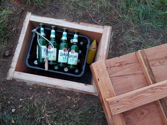 Im Boden ist noch ein weiteres Highlight eingelassen. Es wurde ein Erdloch geschaffen, das für einen Getränkekasten Platz hat. Über Kasse des Vertrauens kann sich dort jeder Vorbeikommende gegen 1 EUR ein kühles Getränk gönnen.