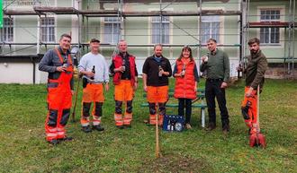Challenge gemeistert! Mitarbeiter der Stadtverwaltung und Bürgermeister nach Abschluss der Pflanzaktion am Landambulatorium in Schalkau