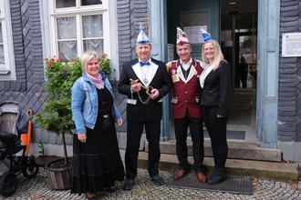 Pünktlich am 11.11. um 11.11 Uhr zogen - angeführt von ihrem Marschall Nicky - das Prinzenpaar, die Prinzengarde, die Prinzessinnengarde, der 11er Rat und weitere große und auch kleine Narren in das Schalkauer Rathaus ein.