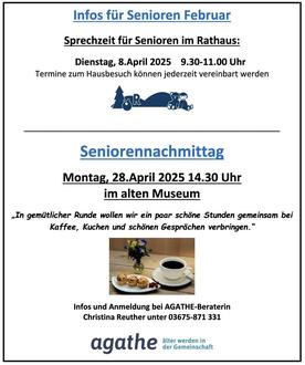 Als AGATHE-Beraterin bin ich Ihre Ansprechpartnerin, für alle Fragen, die der Alltag als älterer Mensch mit sich bringt. Die Beratungen sind kostenfrei und unverbindlich!