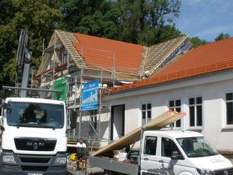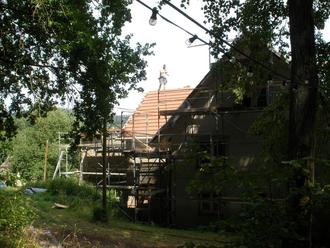 Bis Mitte August sollten die Arbeiten am Dach zum größten Teil abgeschlossen sein. In den nächsten Tagen erfolgt die komplette Verblechung der Kehlen und Ortgänge und die Installation der Dachrinne durch den Klempner.