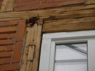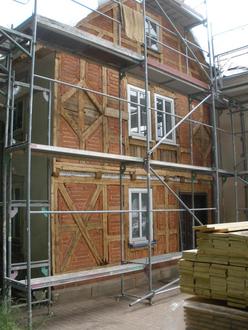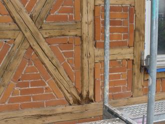 Zugleich erfolgt die Sanierung der historischen Fachwerkfassade. Hier werden geschädigte Holzteile ausgetauscht und die ausgemauerten Fachwerkfelder ausgebessert bzw. instandgesetzt.