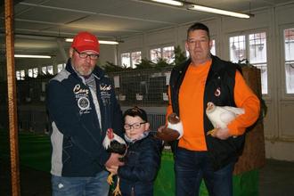 v.l. Enrico Wichmann, Linus Wichmann und der Vereinsvorsitzende Maik Sack. Sie stellten unter anderem ihre sehr gut bewerteten Züchtungen aus wie die (v.l.) Zwergwyandotten türkenfarbig, Strasser rot und Zwergwyandotten weiß aus.