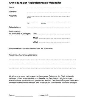 Wer als Wahlhelfer ehrenamtlich tätig werden will, füllt bitte die Anmeldung (siehe Anlage) zur Registrierung als Wahlhelfer aus und schickt diese per