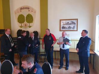 Auch Dirk Hirsch bedankte sich für die Arbeit der Feuerwehr der letzten Jahre und berichtet, dass eine gemeinsame Ausbildung der einzelnen Feuerwehren mit der Feuerwehr Schlotheim als Gesamtheit für vorteilhaft auszuzeichnen ist. 40 Stunden Ausbildung im Jahr ist nicht viel, es ist immer eine gute Sache für die Gemeinschaft. Zum Schluß der Jahreshauptversammlung wurde an drei Kameraden, Dominik Hartung, Chris Vattrodt und Heiko Vattrodt, die Ernennungsuhrkunde zum Maschinisten überreicht. Des weiteren wurde eine Schiefertafel mit einem Bild unseres alten B1000 und des Mehrstedter Wappen als Andenken für die geleistete Arbeit in der Einsatzabteilung an Kamerad Siegfried Wipper, Kamerad Reiner Linke und Kamerad Rüdiger Langstädtler überreicht, die Kameraden sind in die Altersabteilung übergetreten und sind der Feuerwehr im Verein treu geblieben.