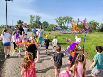 Bei herrlichem Sonnenschein und mit eigens bunt gebastelten Maistöcken zogen die Kinder des Kindergarten „Arche Nouva“ am 30. April 2024 gegen 17.30 Uhr zusammen mit ihren Familien zur Festwiese des traditionellen Maifeuers in Neunheilingen.