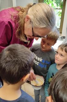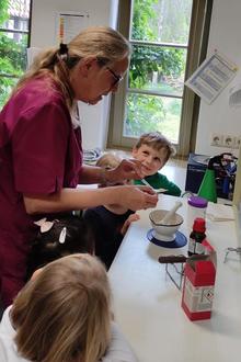 Die Schubladen waren fast 4x so lang wie Zuhause. Dort würde also viel Spielzeug hineinpassen. Natürlich waren hier in den Schubladen des Apothekerschrankes viele Kartons mit Medikamenten, Salben und Tabletten. Die Kinder erzählten, welche Medizin sie schon einmal in der Apotheke mit Mama kauften. Außerdem gibt es eine "Küche" bzw. ein Labor in dem die Apothekerinnen auch Medizin z.B. Salben oder Nasentropfen, Zäpfchen herstellen. Hier zeigte Frau Koch den Kindern wie eine Salbe hergestellt wird.