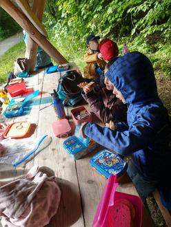 Nach einem Frühstückspicknick ging es auf eine geheimnisvolle und interessante Wanderung immer dem Taubensymbol folgend. Verschiedene Stationen luden uns ein, sich im Märchenwald Prüfungen und Aufgaben zu stellen. Märchenzitate und Märchentexte waren ein weiterer Schlüssel zu den geheimen Zugängen des Feenwaldes. Außerdem entdeckten wir die Natur mit all unseren Sinnen. Natürlich durfte ein Spielplatzaufenthalt nicht fehlen. Nach einem stärkenden Mittagessen aus dem Rucksack ging es dann mit dem Bus nach Schlotheim, wo ein leckeres Eis auf die kleinen Entdecker wartete, bevor wir uns auf den Rückweg in den Kindergarten machten.