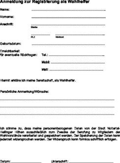 Wer als Wahlhelfer ehrenamtlich tätig werden will, füllt bitte die Anmeldung (siehe Anlage) zur Registrierung als Wahlhelfer aus und schickt diese per