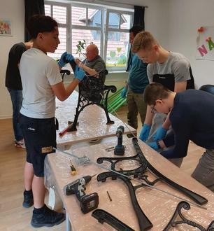 Im Familienzentrum „Der Knotenpunkt“ haben die Jugendlichen gemeinsam mit den freiwilligen Helfern Ayhan und Jan zwei alte Bänke neu gestaltet. Mit viel Geschick wurde geschliffen, gestrichen, gesprayt, gelacht und kreativ gearbeitet.