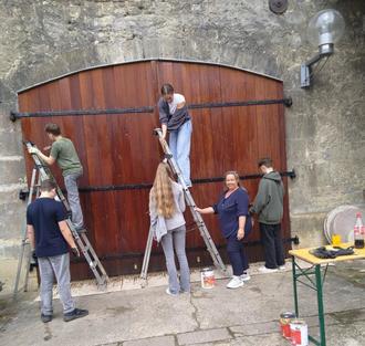 Nach der Begrüßung im Heimat- und Technik Museum Mehler wurden die Helfer in Gruppen eingeteilt. Unter der Betreuung der ehrenamtlichen Vereinsmitglieder haben die Mädchen altes Geschirr sortiert und die Jungen bearbeiteten mehrere Holztore durch Abschleifen und Streichen. Gemeinsam stellten die Jugendlichen zudem einen festlich geschmückten Pfingstbaum im Eingangsbereich des Museums auf.