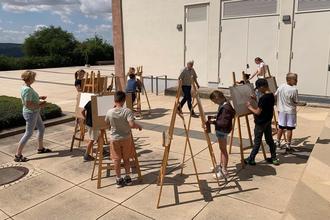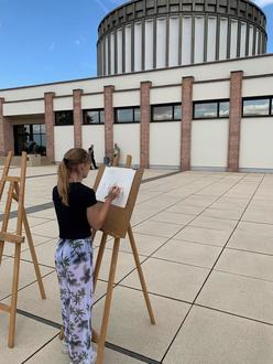 Denn danach gingen wir in das Atelier und die Jungen und Mädchen sollten so malen wie Tübke (deswegen die drei Details, die sie auf ein A3-Blatt übertrugen). Die Sonne schien und mit ihrer Staffelei ging es hinaus ins Freie. Dort hatten sich Frau Dölle und Frau Delert zu einem Standbild aufgestellt. Die Beiden kamen mit auf das A3-Blatt. Wer damit fertig war, schnappte sich seine Staffel und ging zur dritten Aufgabe, im Hintergrund das Gebäude des Panoramamuseums zu zeichnen. Es war erstaunlich, was die Grundschulkinder für tolle Ergebnisse präsentierten.