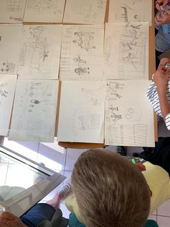 Wir traten in das Gebäude und schauten uns Bilder und Skizzen Tübkes, die in den Gängen an der Wand hängen, an und setzten uns dann im Kreis um unseren Museumsführer, der uns einiges über den Bauernkrieg erzählte und auch die Kinder durch Fragen mit einbezog.