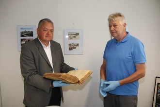 Der 1. Vorsitzende des Vereins, Herr Helge Görl, übergab dem Leiter des Kreisarchives des Unstrut-Hainich Kreises, Herrn Michael Zeng, dieses historische Gerichtsbuch.