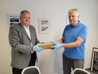 Der Vorsitzende des Geschichtsvereins Schlotheim Helge Görl (rechts) überreicht dem Kreisarchviar Michael Zeng ein historisches Gerichtsbuch aus der Seilerstadt.