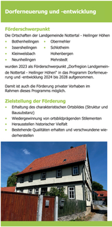 im letzten Jahr informierten wir darüber, dass unser gemeindliches Entwicklungskonzept (GEK) überzeugt hat und wir als Förderschwerpunkt der Dorferneuerung aufgenommen wurden. Erste Maßnahmen wurden beantragt und teilweise auch bewilligt.