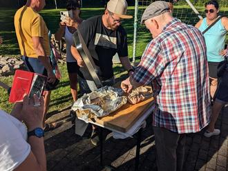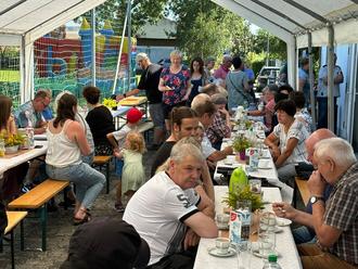 Am Abend wurde es dann kulinarisch: Das gemeinsame Abendessen mit dem legendären „Erdschwein“, Thüringer Rostbratwürsten, Grillkäse und einer Vielzahl an frischen Salaten war ein Highlight. Hier zeigte sich erneut die Stärke der Dorfgemeinschaft, die nicht nur das Essen, sondern auch das gesellige Beisammensein in den Mittelpunkt stellte. Der anschließende Filmabend mit historischen Aufnahmen aus dem Dorfleben, darunter der „Dorfausflug in’s Urtal“ und die „888-Jahrfeier“, bot nicht nur Nostalgie, sondern auch einen schönen Abschluss des Festes.