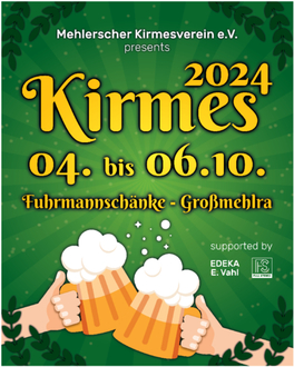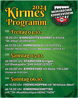 Vom 04.10.2024 bis zum 06.10.2024 findet unsere Kirmes statt.
