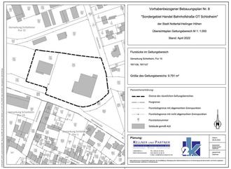 Der Stadtrat der Stadt Nottertal-Heilinger Höhen hat in der Sitzung am 19.08.2024 den überarbeiteten Entwurf des vorhabenbezogenen Bebauungsplanes Nr. 8 „Sondergebiet Handel Bahnhofstraße, OT Schlotheim“ der Stadt Nottertal-Heilinger Höhen gebilligt und zur erneuten öffentlichen Auslegung und Beteiligung der Träger öffentlicher Belange bestimmt. Der überarbeitete Entwurf des vorhabenbezogenen Bebauungsplanes Nr. 8 „Sondergebiet Handel Bahnhofstraße, OT Schlotheim“ der Stadt Nottertal-Heilinger Höhen mit Vorhaben- und Erschließungsplan (Teil A+B) und der überarbeitete Entwurf der städtebaulichen Begründung nebst Anlagen (Teil C) liegen vom