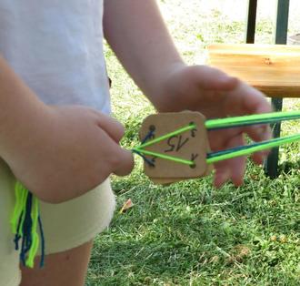 Eine Station des umfangreichen Programms war die Herstellung von Seilen und Anfertigung von Freundschaftsbändern mittels der Technik des Brettchenwebens.