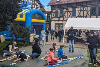Die Kinder konnten sich zudem beim Bobbycarrennen, Eierlaufen, Sackhüpfen, Stelzenlaufen, Mausefalle, Skilaufen, Kinderschminken und Büchsenwerfen austoben. Für die kreativen Köpfe gab es die Möglichkeit, Holzbretter für den Spielplatzzaun zu bemalen.